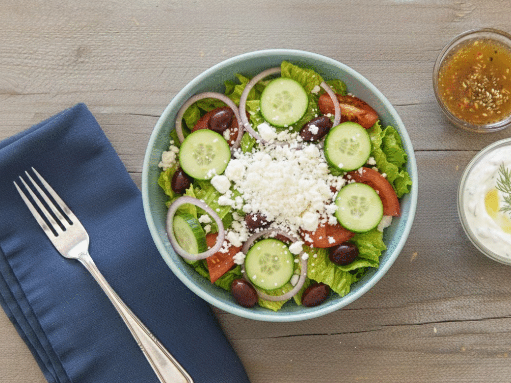Crisp romaine lettuce, juicy tomatoes, cool cucumbers, sharp red onions, feta, and Kalamata olives. Served with warm pita bread and our house made Greek vinaigrette.