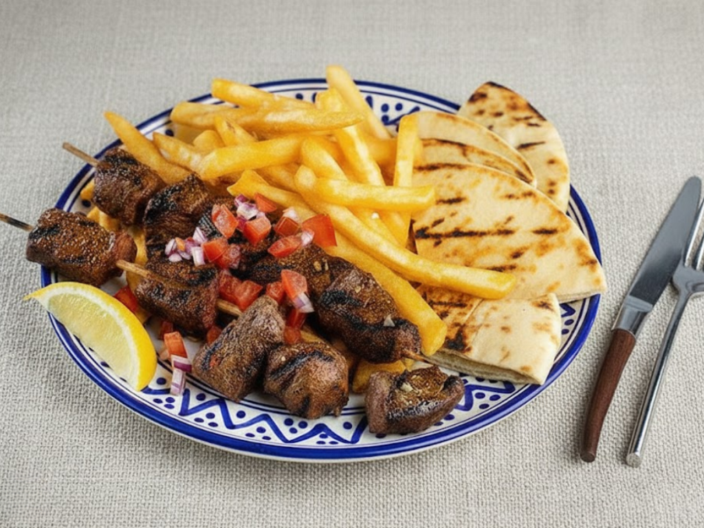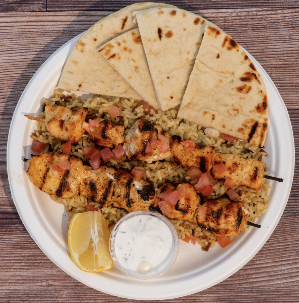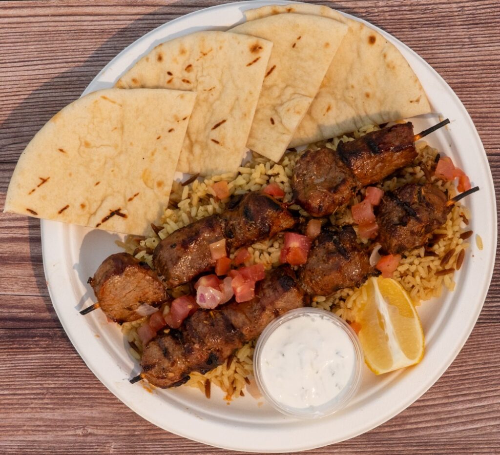 Two skewers of your favorite grilled protein, served with warm pita bread and tzatziki, your choice of a delicious side : French fries (+$0.50),Zeus cheese fries (+$0.50) ,Golden potatoes, Greek rice, Side salad.