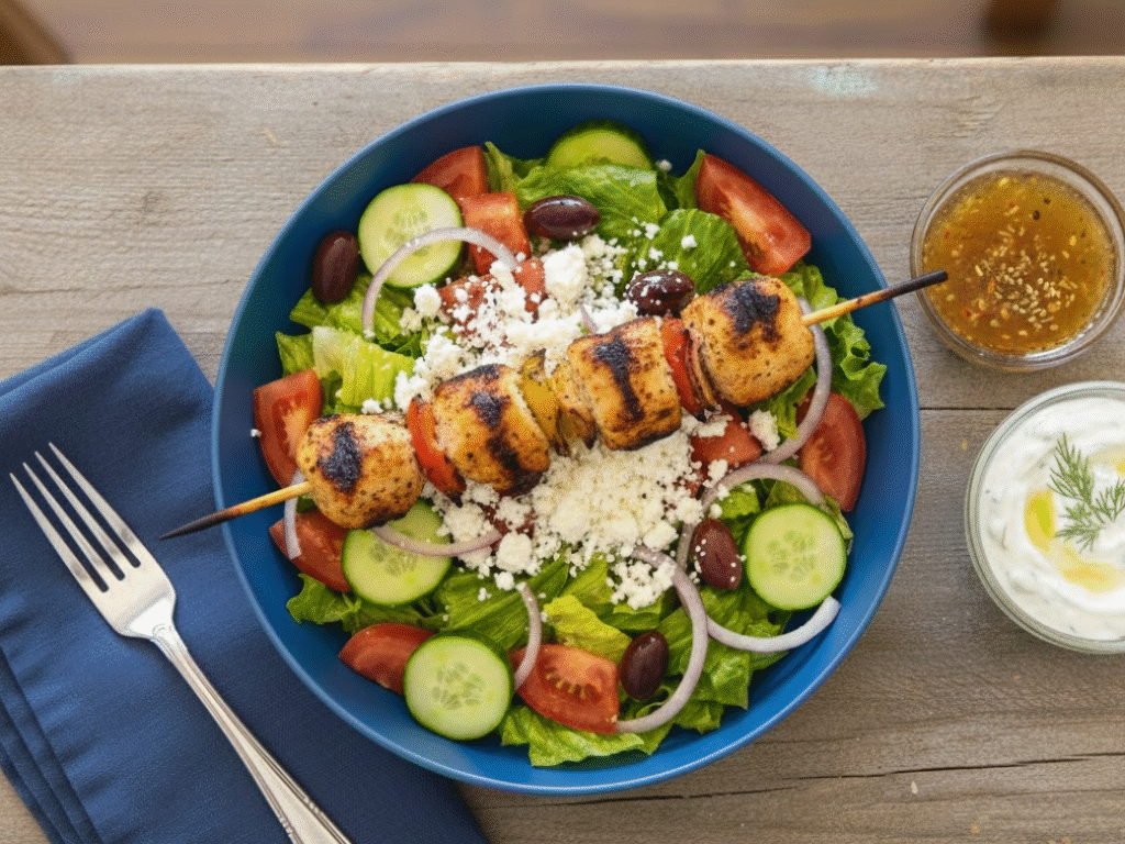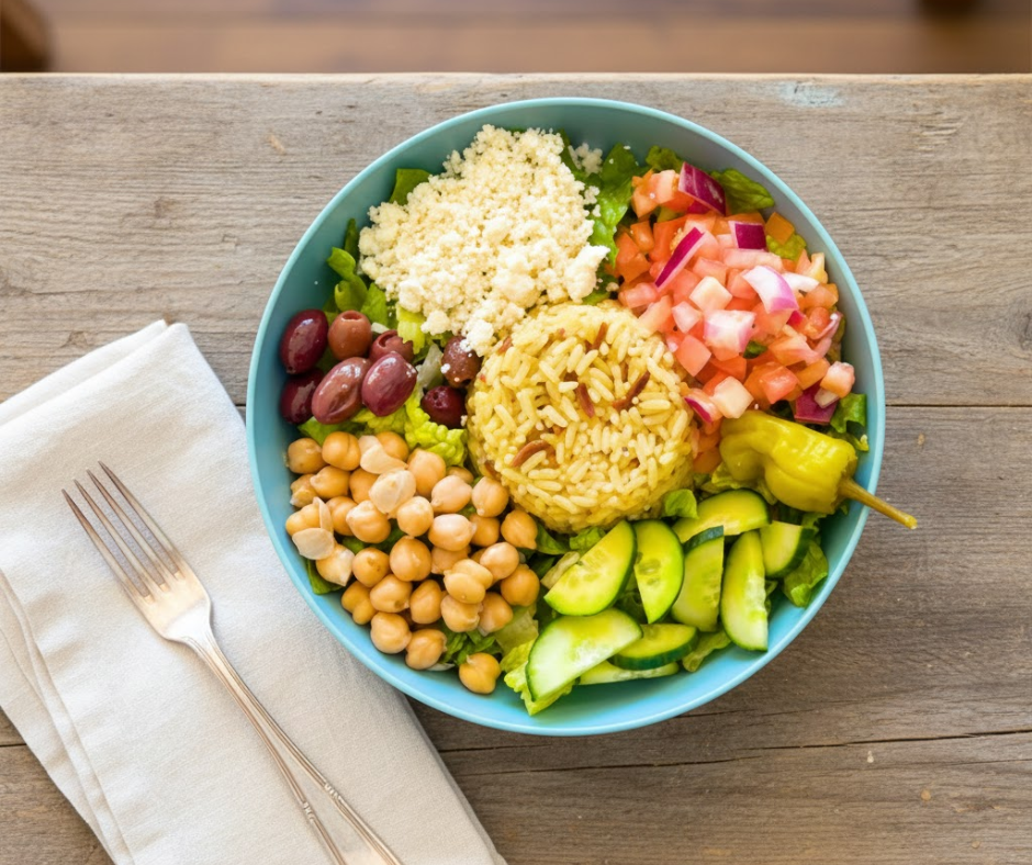 Fluffy rice pilaf topped with crisp romaine lettuce, tomatoes, red onions, cool cucumbers, garbanzo beans, Kalamata olives, feta, and tzatziki.
